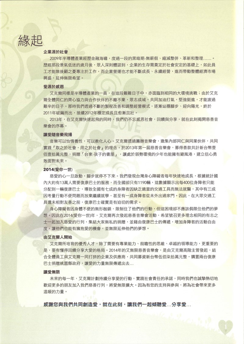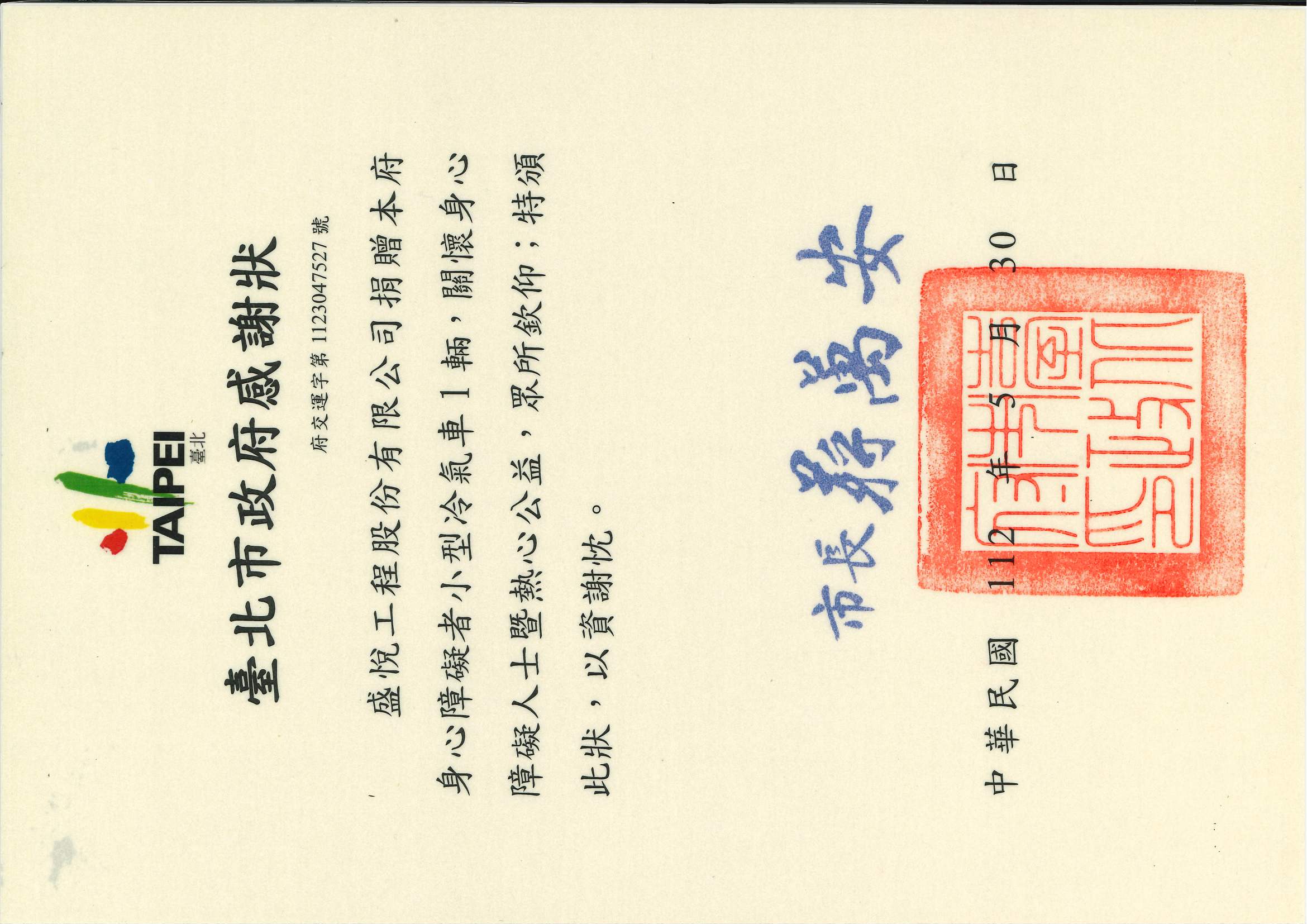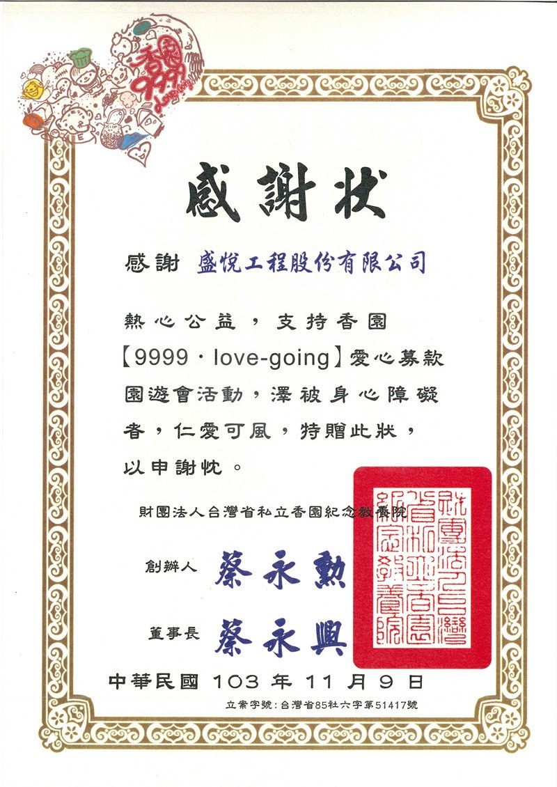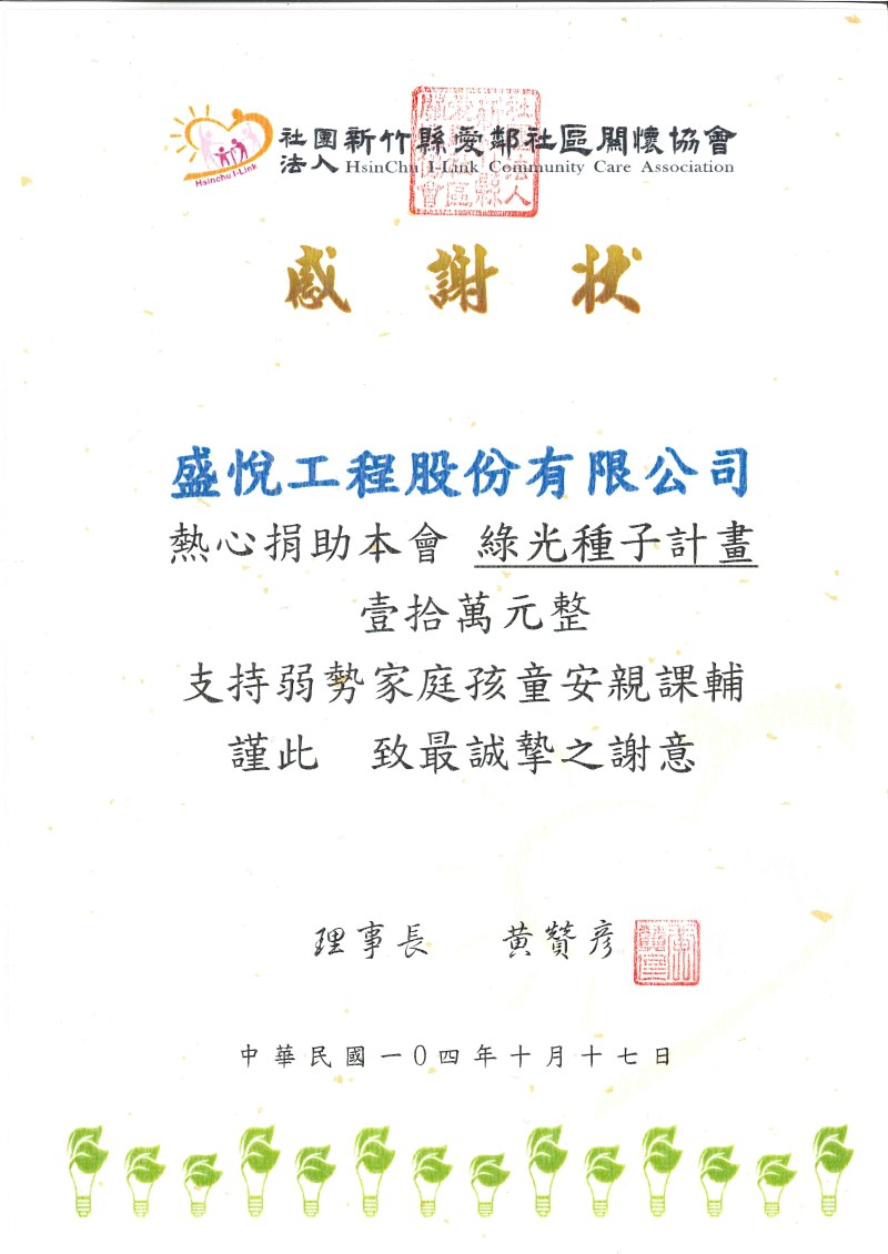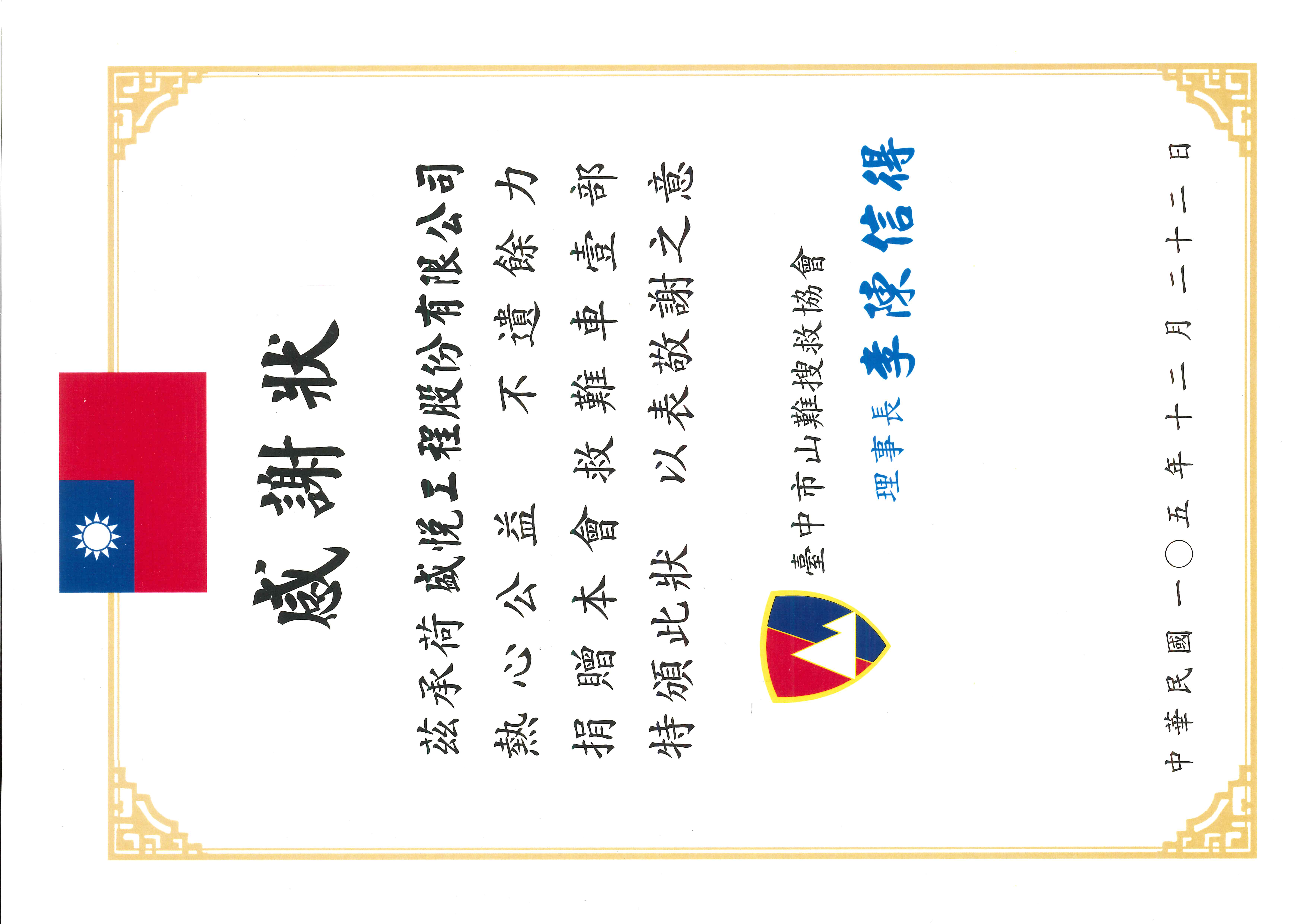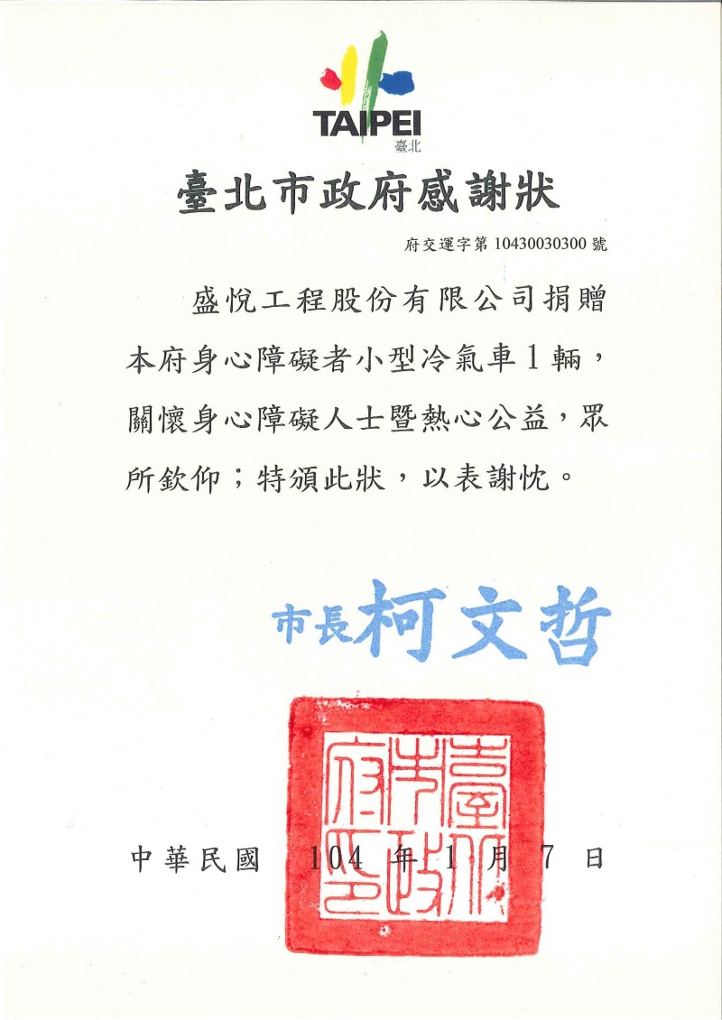 有感於台灣弱勢團體眾多,需要民間企業能盡點力量,分擔些社會責任。本公司除配合慈善團體之需要而戮力捐疏贊助,如遇到天災或災難事故也會即時伸出援手捐 款贊助不落人後,且在公司有盈餘的條件下,也捐贈復康巴士予台北市政府,提供協助弱勢身障族群,有較佳的行動能力,以盡企業人「取之於社會,用之於社會」 的回饋精神,為社會盡份心力。